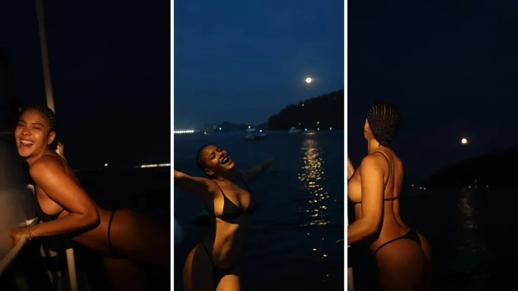 Bella Campos faz passeio de barco noturno no Rio de Janeiro. A atriz abriu a semana, na noite desta segunda-feira