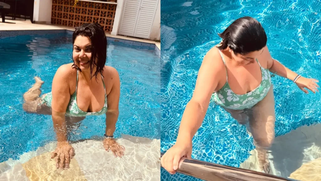 Fabiana Karla de maiô verde chamou a atenção dos seguidores ao aproveitar o domingo (9) na piscina de sua casa,