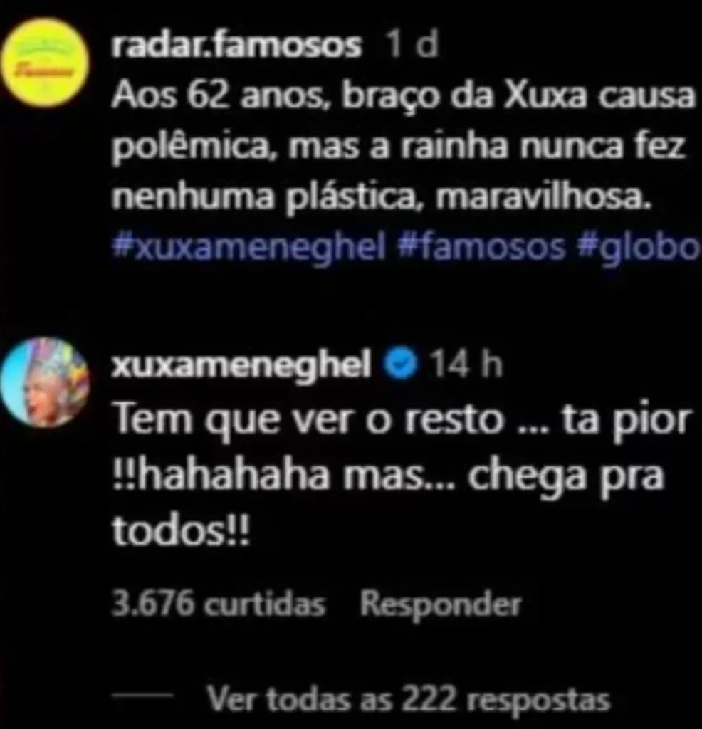 Xuxa reage a críticas sobre flacidez nos braços em um vídeo que circulou nas redes sociais e motivou comentários sobre