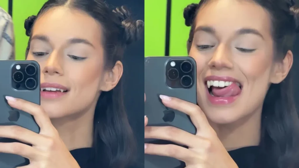 Alane Dias exibe dentes de vampiro e faz suspense agora. A ex-BBB apareceu nas redes sociais com próteses afiadas nos