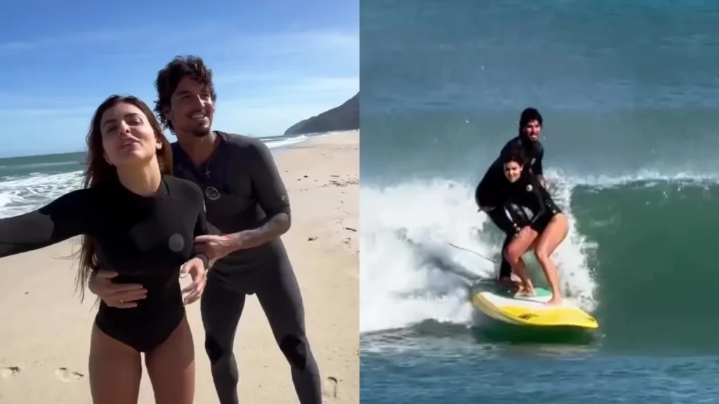 Isabella Arantes publicou nesta terça-feira (2) um vídeo em que recebe instruções de surfe do namorado, o tricampeão mundial Gabriel