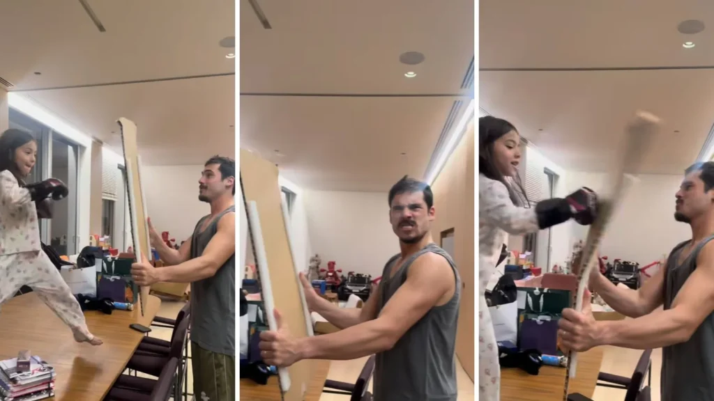 Larissa Manoela e André Luiz Frambach adicionaram um novo elemento à rotina de treinamento compartilhada: a imersão em água gelada.