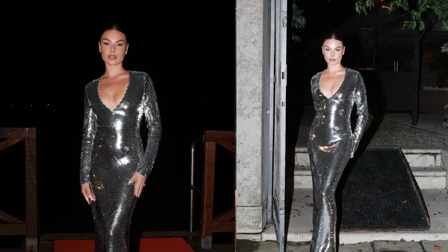 Isis Valverde chamou atenção ao surgir com um vestido prateado de decote profundo, assinado pela grife italiana Bottega Veneta, na
