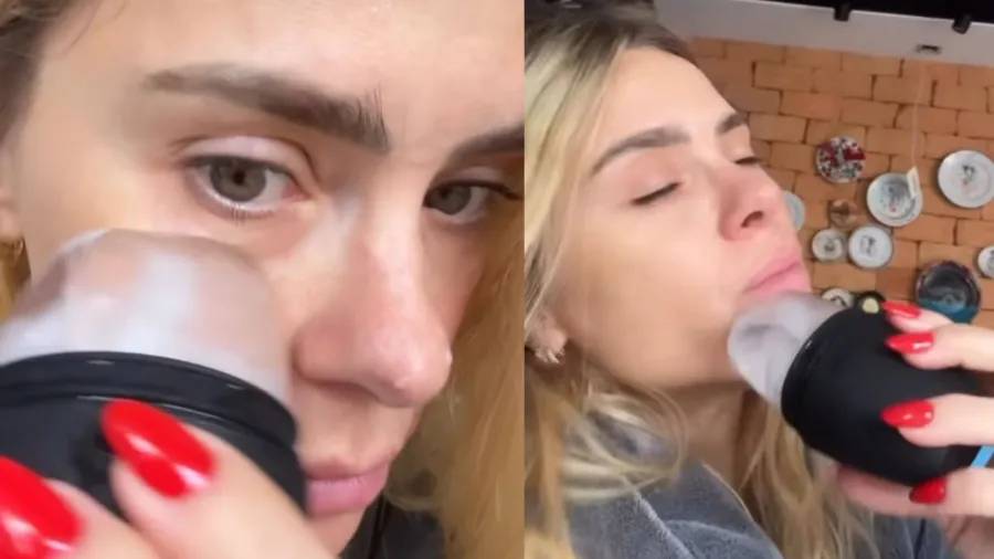 Carolina Dieckmann compartilhou em suas redes sociais um vídeo no qual aplica uma pedra de gelo no rosto durante o