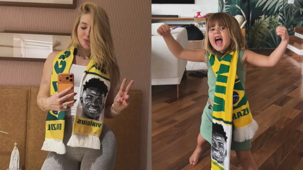 Virginia mostra filha Maria Alice, de três anos, usando o cachecol verde-amarelo que Vini Jr presenteou a influenciadora para a