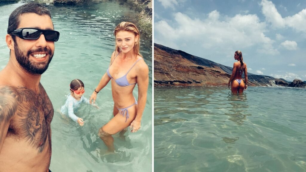 Cintia Dicker vai à praia na companhia de Pedro Scooby e da filha Aurora, de 3 anos, para aproveitar a